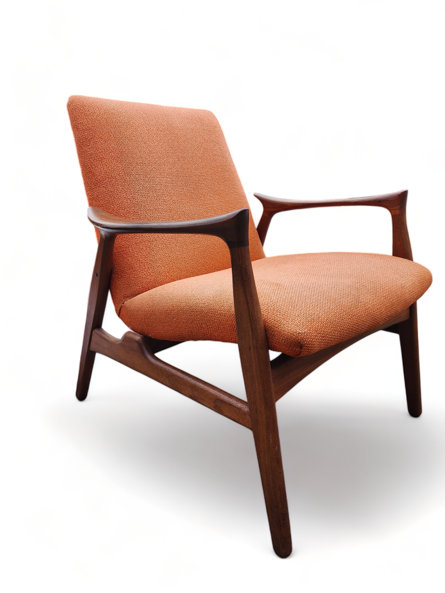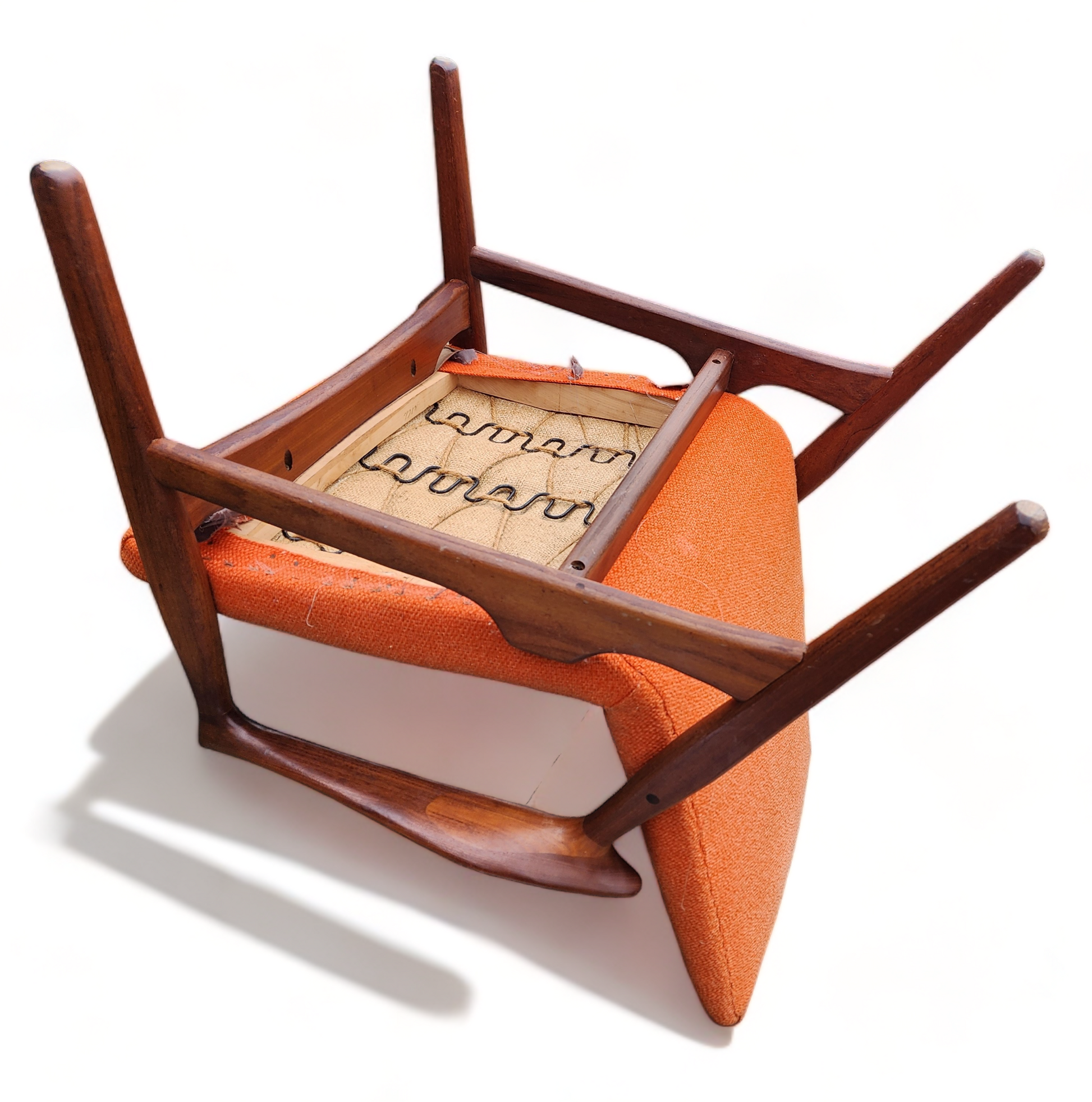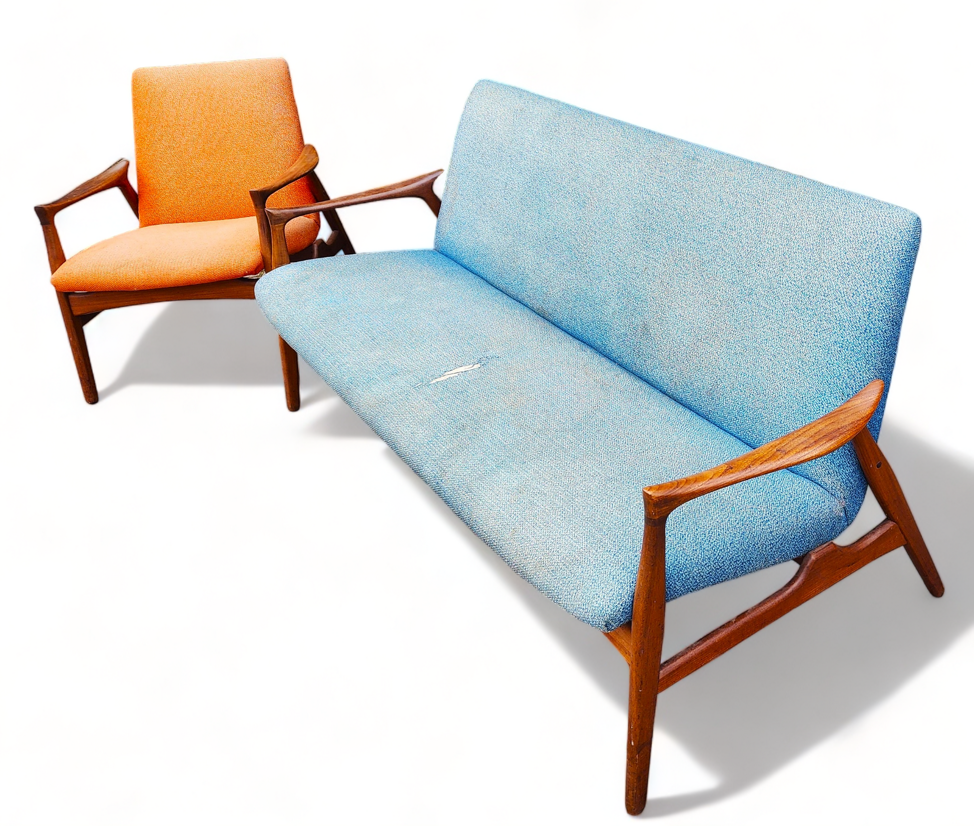 Both sofa and chair will be dismantled to the bare wood frame, springs checked, and then will be rebuilt again using high-quality foam and fabric of your choice. The teak parts will be stripped, sanded, and refinished with Danish oil to brand-new condition.